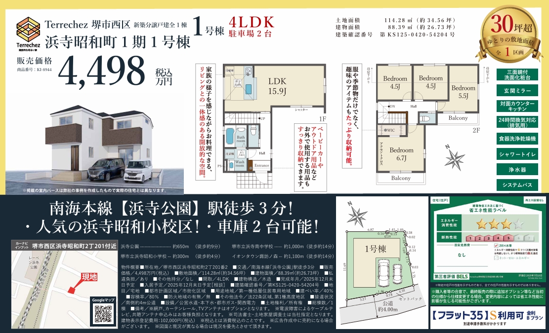 4LDK / 土地面積 114.28㎡(34.56坪)/ 建物面積 88.39㎡(26.73坪)