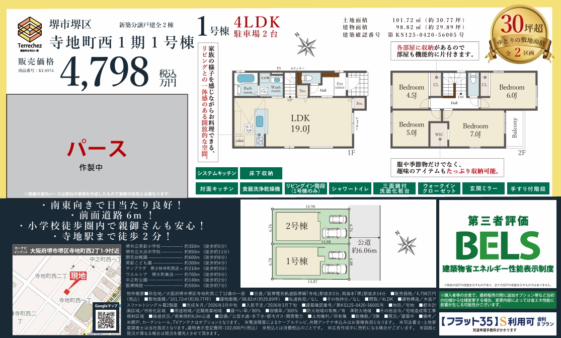 4LDK / 土地面積 101.72㎡(30.77坪)/ 建物面積 98.82㎡(29.89坪)