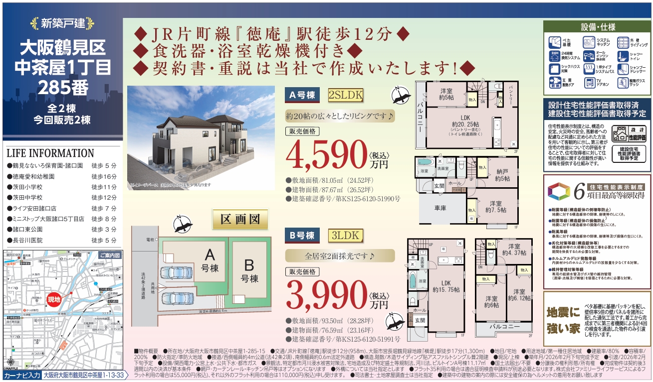 大阪市鶴見区中茶屋 新築分譲住宅 ~ハートフルタウン~ 全2棟