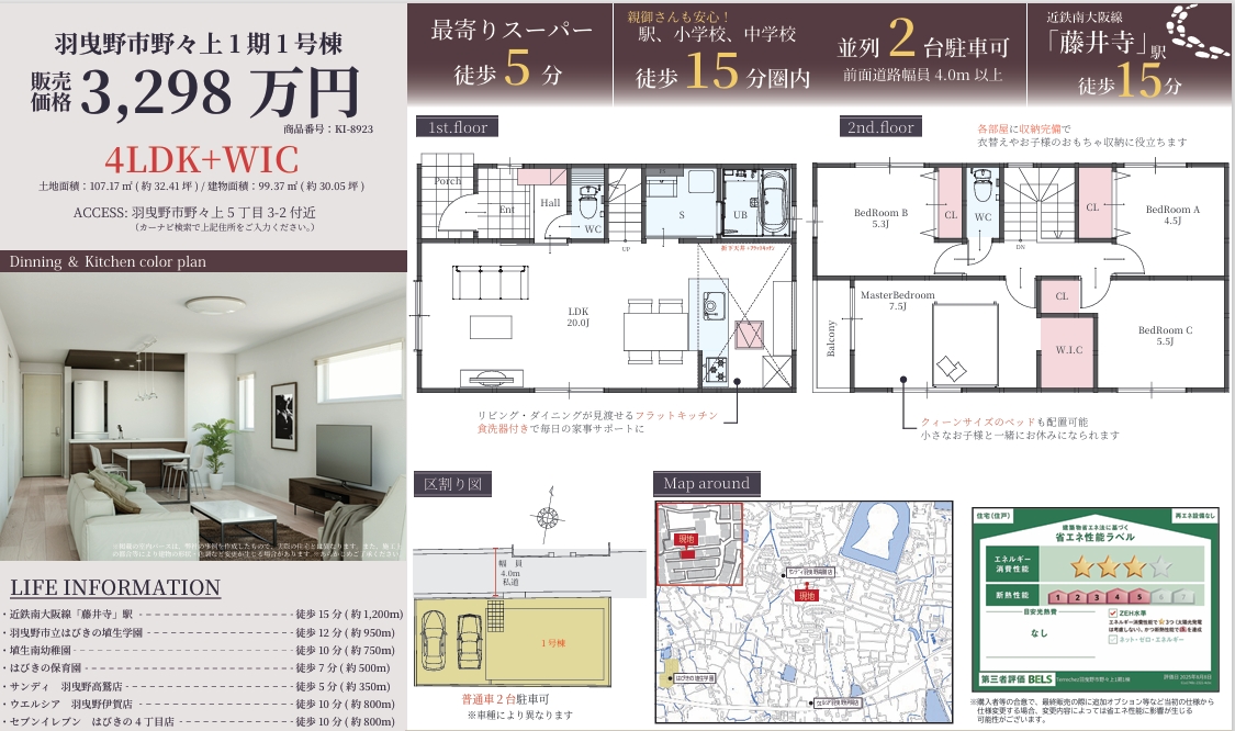 4LDK+WIC / 土地面積 107.17㎡(32.41坪)/ 建物面積 99.37㎡(30.05坪)